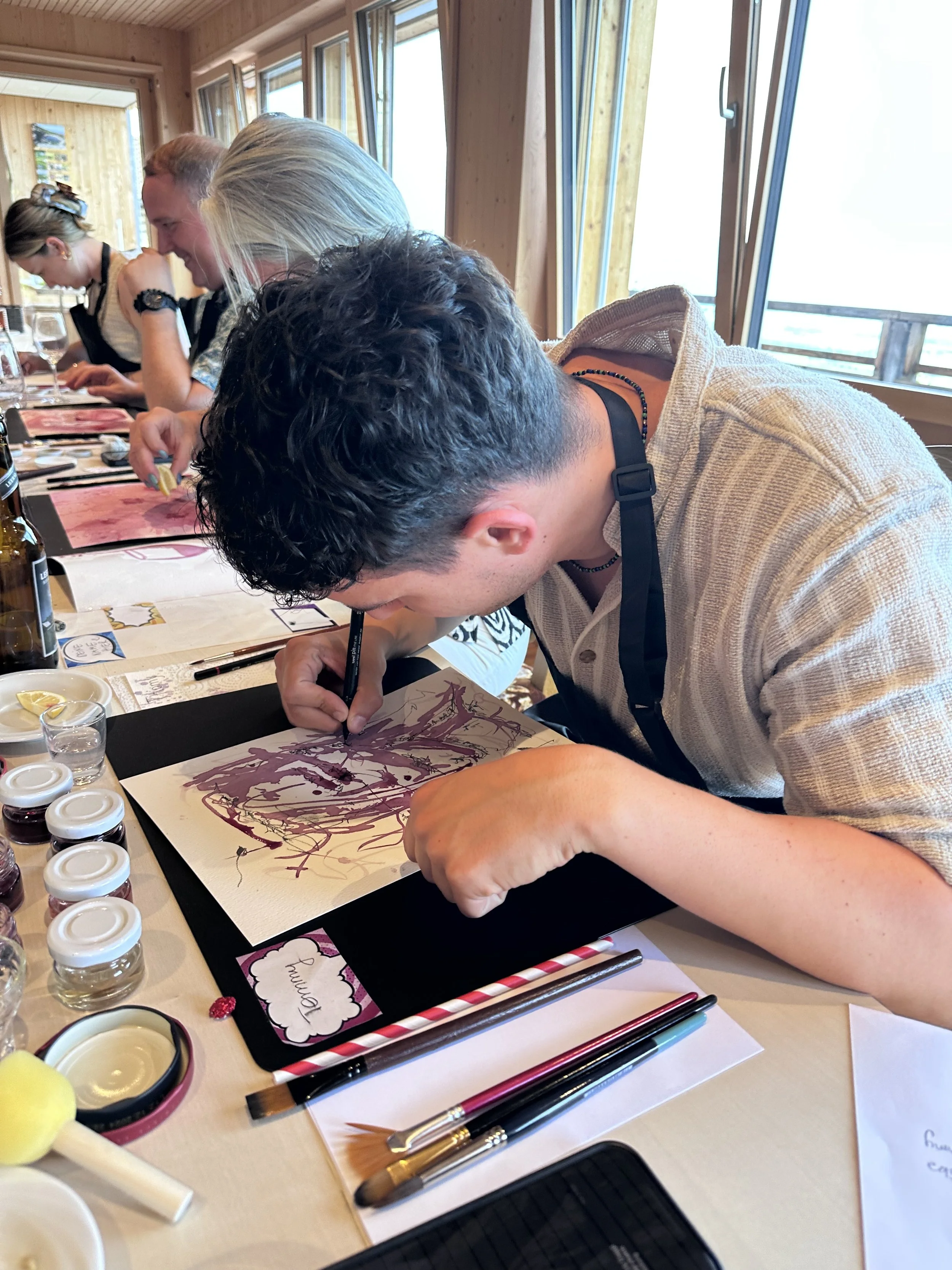 Offene Workshops bieten die Möglichkeit, die Technik des Malens mit Wein zu entdecken und gleichzeitig die Farben und Aromen edler Weine zu geniessen. In entspannter Atmosphäre, begleitet von guter Musik und einem stilvollen Ambiente, wird das Malen zu einem besonderen Erlebnis.
