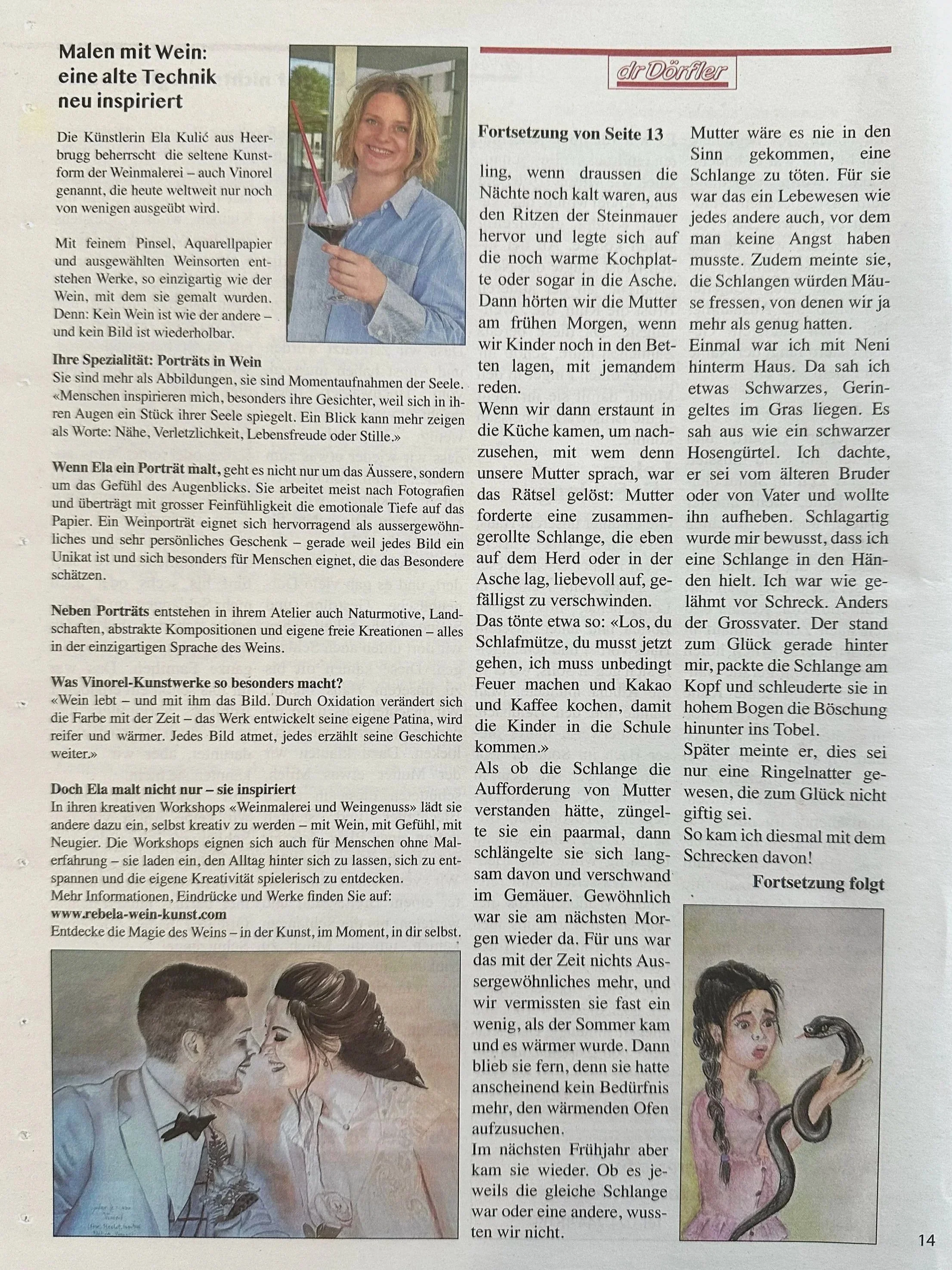 Der Dörfler berichtet über meine besondere Art, Porträts mit Wein zu malen – eine Technik, die auf dem Papier weiterlebt.